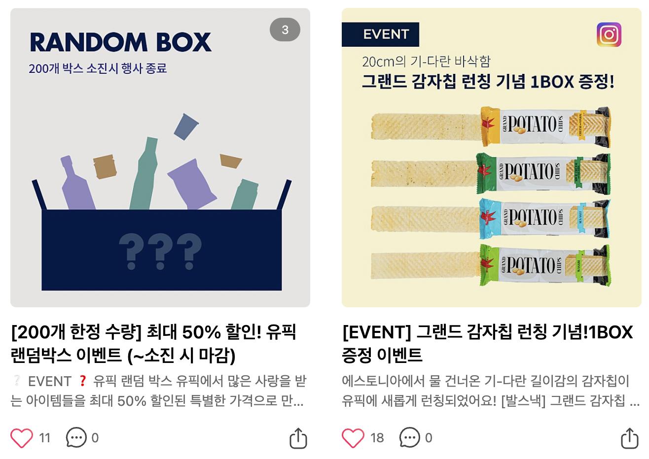 서비스 안정화 단계를 지나 최근에는 신규 유저 확보를 위해 다양한 이벤트를 기획하고 있는 것으로 보입니다. 유픽 공식 블로그를 들어가보면 블로그 리뷰 체험단 모집 글이 정기적으로 올라와 있는 것을 확인할 수 있습니다. 유픽은 팀의 큐레이션 역량과 소비자의 피드백을 위주로 운영됩니다. 빠른 배송보다는 믿을만한 리뷰가 소비자의 마음을 움직일 것이라고 생각합니다. 자발적인 바이럴을 유도하는 이벤트는 아니지만, 소비자의 입을 빌려 제품을 어필할 수 있는 기회를 지속적으로 만들고자 합니다. 그 외에도 인스타그램 협찬(=유픽프렌즈)을 통해 브랜드를 홍보하고 있었습니다.