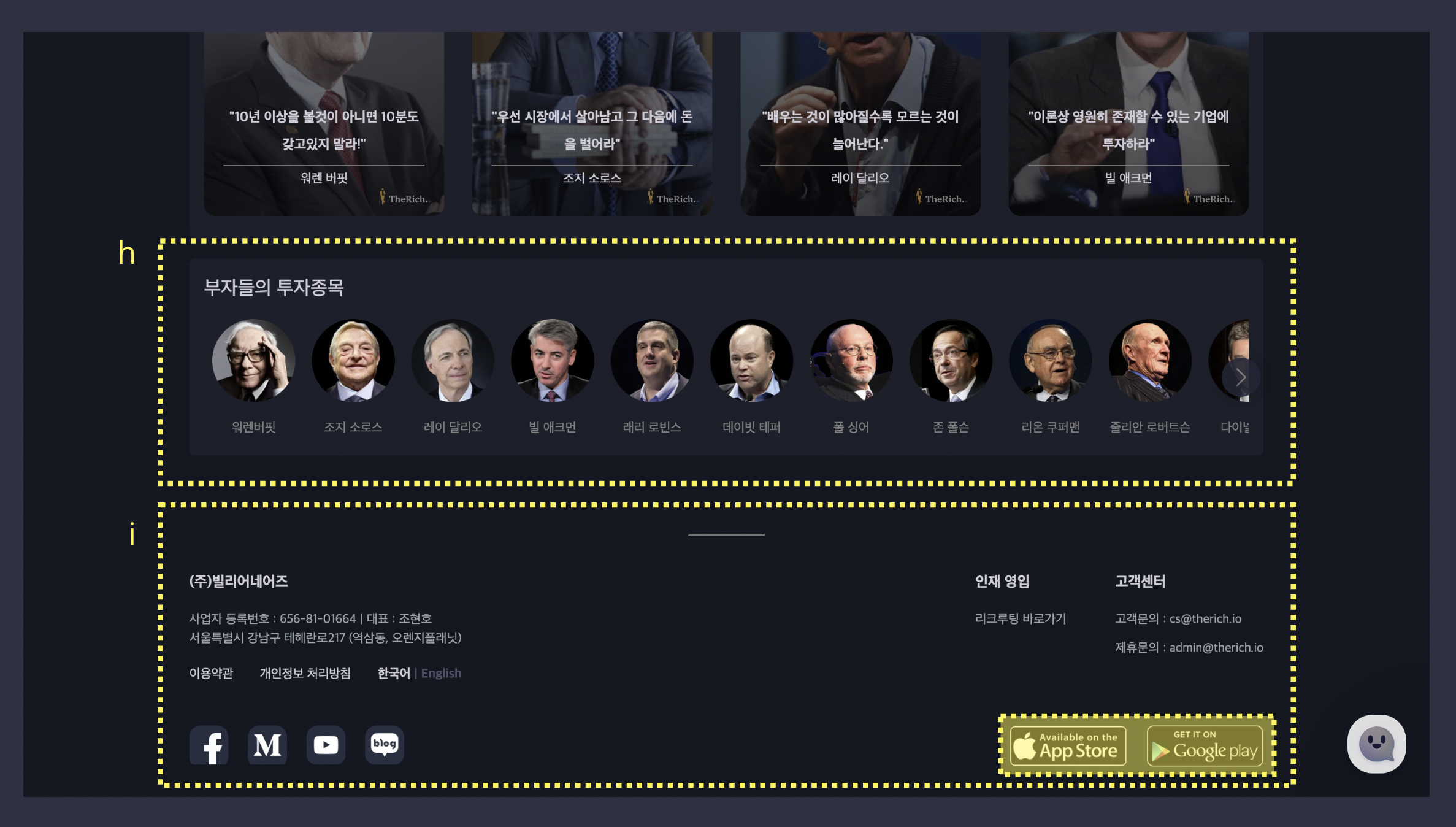 아래 이미지들 중 맨 처음은 랜딩 페이지의 첫 화면을 캡처한 것이다. 두 번째 이미지부터는 페이지가 어떤 요소들로 이뤄져 있는지 박스로 표시해서 구분해두었다. 노란 박스는 로그인 전후로 변화가 없는 부분, 빨간 박스는 로그인 전에만 보이는 부분이다. 결론부터 말하자면, 더 리치의 랜딩 페이지는 CTA(call to cation)를 유도하는 부분이 특별히 없다.