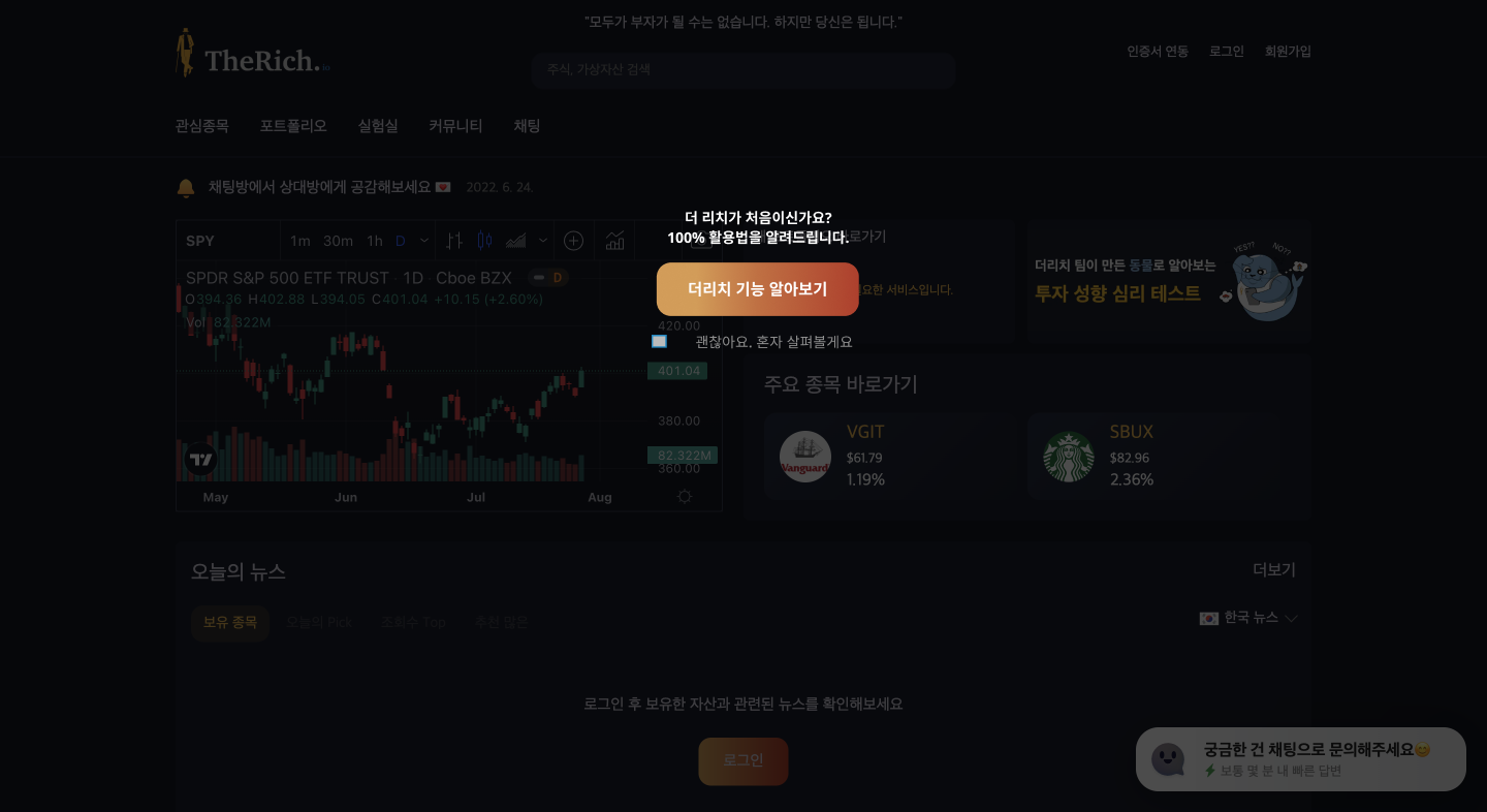 우선, 아래의 첫 번째 이미지에서 볼 수 있듯이 '더리치 기능 알아보기' 버튼을 누르면 튜토리얼처럼 각 기능에 대한 세부 팝업이 뜨면서 기능에 대한 설명을 들을 수 있다. 이 과정에서 유저들은 더리치의 기능(배당 캘린더, 커뮤니티 기능, 실험실 수익률 계산)을 알고 어떤 순서로 사용하면 좋을지 대략적으로 익힐 수 있게 된다.
