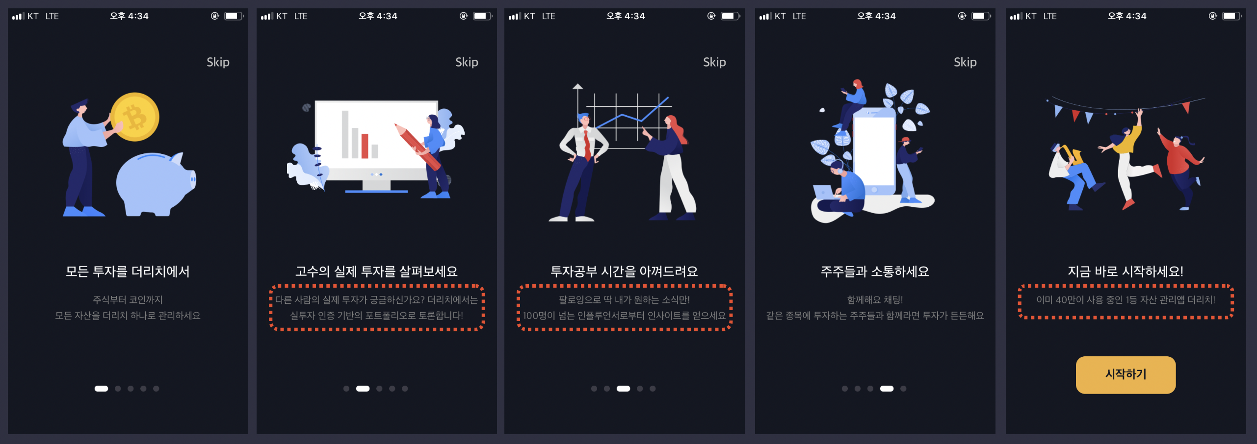 위의 이미지들은 앱을 처음으로 실시하면 보이는 화면이다. 각각의 이미지 아래 자세히 보면 회색 문구로 온갖 '믿음직한' 문구들을 확인할 수 있다.